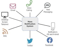 Mass notification systems have a database of names, phone numbers, email addresses and delivery methods. Emergency notification software must have a strong communications infrastructure with enough bandwidth to deliver thousands of messages. People and organizations can be contacted via prerecorded phone calls, text messages, emails and social media. Human action can activate an MNS, as can sensing devices such as smoke or gas detectors and specialized task-specific systems for such things as security.